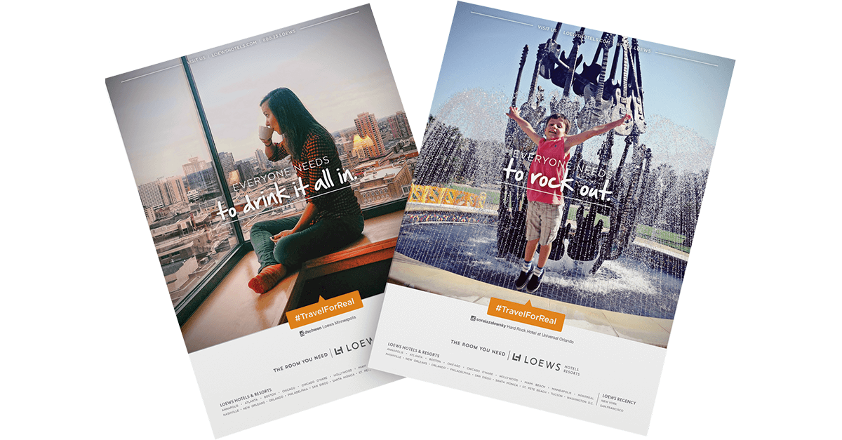 A few travel brands have already started employing their audiences by adopting user-generated content into their online advertising, specifically on social media sites like Facebook, Instagram, and Snapchat. These brands aren’t just engaging with their guests, but they’re communicating with them and sharing their photos to promote their travel experience to other potential guests. Loews Hotels found success with their #TravelForReal campaign that spanned across digital and print ads. The ads featured creative from Instagram photos taken by customers on-property, turning the guests into both the ad models and the photographers. They asked their guests to tag their photos with #TravelForReal so they could share an authentic perspective of the experience at their properties, something you can’t always get from traditional marketing visuals.